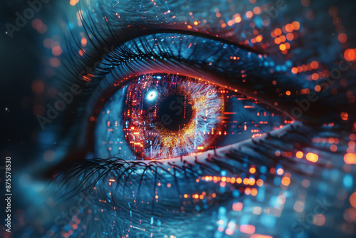 Illustration of digital eye neon style on dark blue background, computer vision and hightech technology concept. 3D Rendering