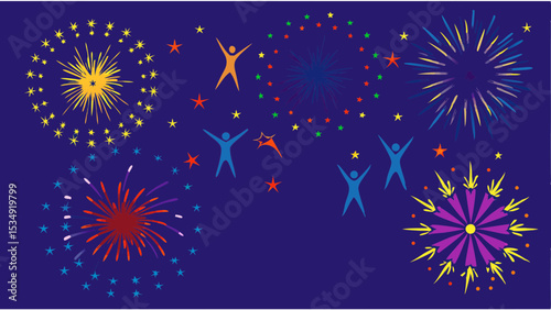 Illustration of fireworks and stylized figures with stars on a dark blue background design theme