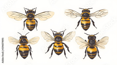 Illustration of five distinct types of bees showcasing their intricate details and vibrant yellow and black patterns.
