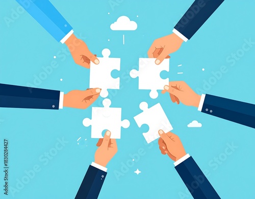 Illustration of hands holding jigsaw puzzle pieces, assembling together