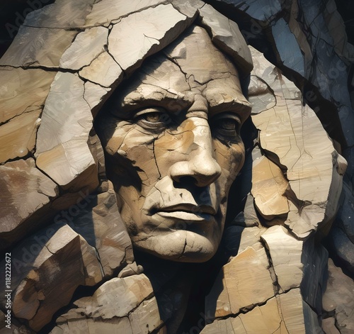 Illustration of human face in rock with cracked detail.