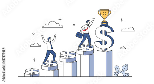 Illustration of people climbing stairs towards a trophy on a dollar sign representing financial success and goals
