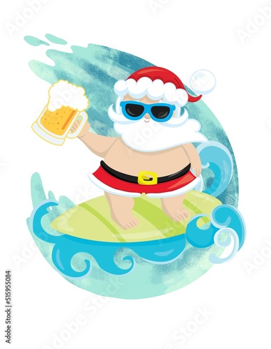 Illustration of Santa surfing with a cold beer. Perfect for Christmas in summer or Christmas in July and international beer day