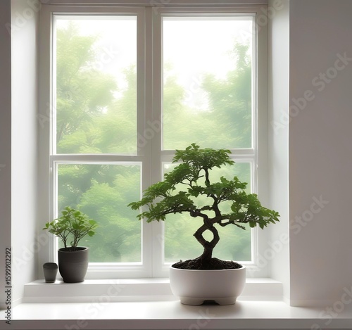 Illustration of Small green plant in a white pot on a windowsill, soft daylight, minimalistic interior, clean wall, no clutter, peaceful vibe.