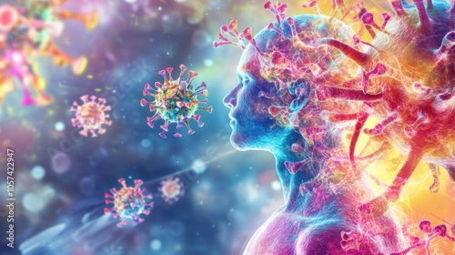 Illustration of the flu virus lifecycle in the human body, vibrant colors