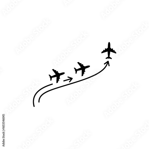 Illustration of three airplanes flying upwards along a curved path, symbolizing travel.