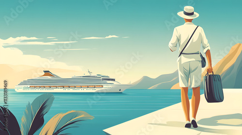 Illustration of traveler with suitcase looking at cruise ship, ocean holiday, luxury vacation, tropical adventure, scenic coastal view, summer journey, maritime tourism