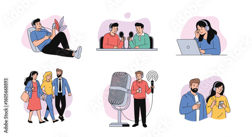 Illustrations of people engaging in various digital communication and content creation activities