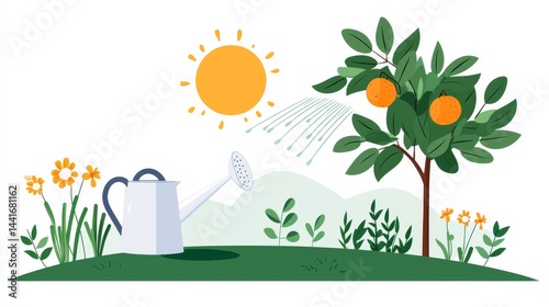 Illustrative Line Art of a Watering Can Nourishing an Orange Tree Under a Bright Sun