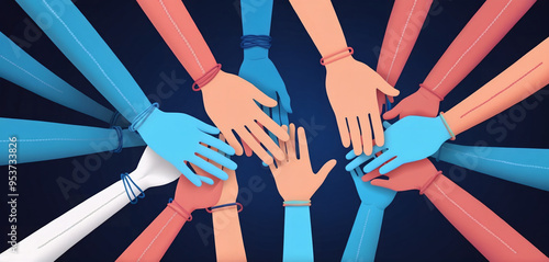 illustrative representation of different hands and arms moving towards each other, symbolizing diversity, understanding, teamwork and rapprochement