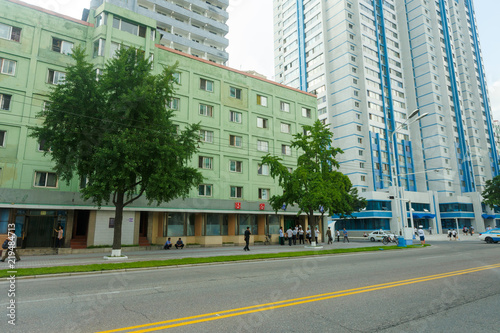 Ilyul 2018 - Pyongyang, North Korea - View from the window of a moving car on the central streets of the capital of North Korea - the city of Pyongyang. North Korea is one of the most closed countries