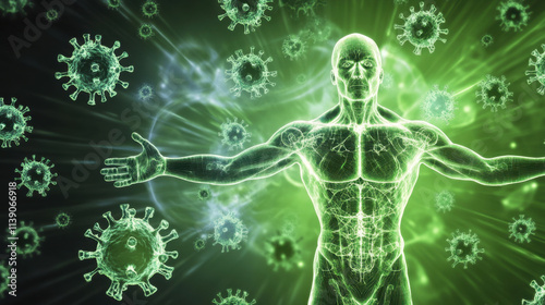 image depicts human figure surrounded by virus illustrations, representing immune system response to pathogens. vibrant green colors emphasize health and vitality