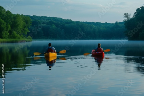 Image of a couple kayaking on a tranquil lake, with their kayaks reflecting in the calm water. Kayaking together, peaceful lake setting, romantic paddle, serene and reflective mood.