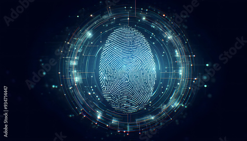 Image of a digital fingerprint appearing on the surface of a computer circuit. which glows with blue light This fingerprint is a symbol of identity verification or biometrics.