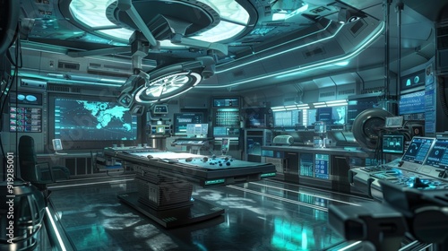 Image of a futuristic operating theater with smart technology and robotic systems, illustrating advancements in surgical procedures and precision.
