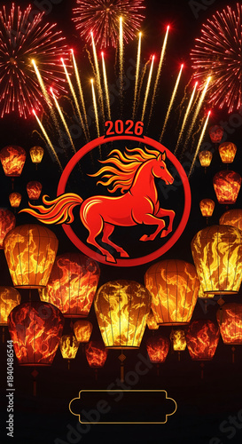 Image of a red horse symbol with fireworks and many paper lanterns. Concept of lunar new year in 2026, celebration, festival and bright background