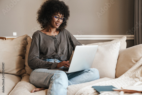 Image of african american woman working with laptop while sitting on sofa