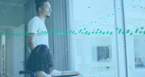 Image of graphs over diverse man and woman on wheelchair looking through glass window