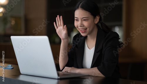 Image of happy asian woman wearing white shirt smiling and waving hand at laptop, while speaking or chatting on video call in office.