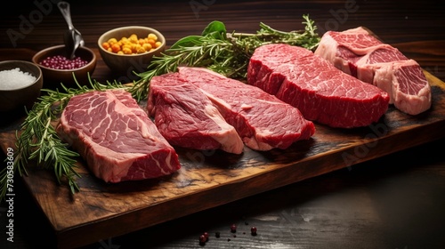 Image of variety of raw meat steaks on a wooden board.