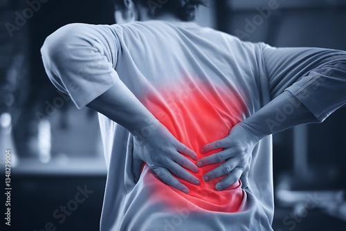 Image shows a person experiencing intense lower back pain, hands gripping their lower back, highlighting the area with red to indicate the pains severity. The image suggests the need for medical atten