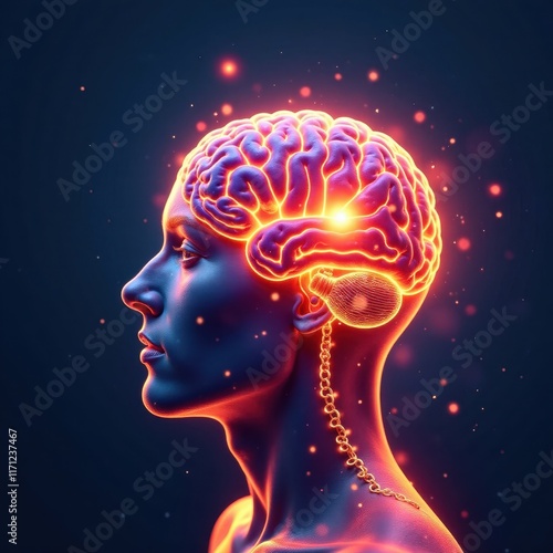 Imagery of a glowing mind with swirling thoughts and ideas floating around it, imagination, abstract thinking