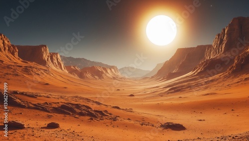 Imaginary terrain of Mars, featuring an orange desert landscape with eroded mountains and a bright sun, realistic depiction of a science fiction Mars scene.