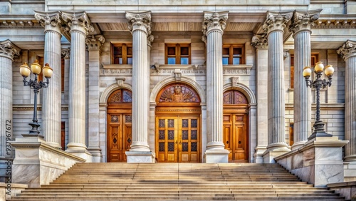 Impressive marble courthouse exterior with grand staircase, ornate pillars, and massive wooden doors, conveying formal authority and justice system's solemnity.