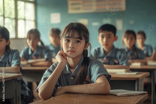 In a classroom setting, diverse young Asian students focus on their lessons while seated at desks. They appear attentive and eager to learn, with notebooks and pens in front of them.
