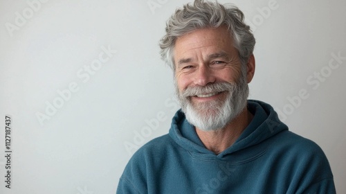 In a cozy indoor space, a cheerful older man with a full beard and gray hair beams with pride. His vibrant smile reveals dazzling teeth, reflecting a life filled with joy and health
