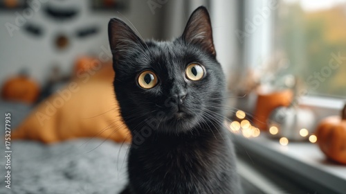In a cozy room adorned with autumn decorations, a curious black cat sits on a soft bed, watching a tiny fairy flutter playfully nearby. Warm light and seasonal charm fill the scene