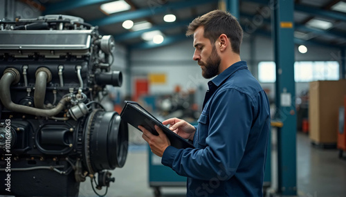 In a garage, a mechanic using a tablet computer diagnoses an industrial truck's diesel engine. Concept of auto repair in the auto industry