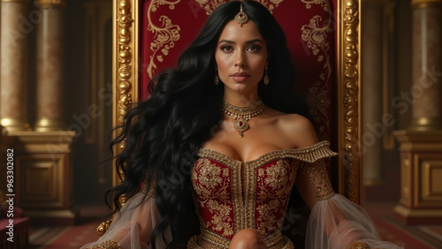 In a grand, opulent palace, a regal queen with long, flowing raven hair and striking amber eyes sits gracefully on her throne.