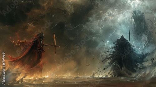In a stormy realm, evil and good face off: darkness cloaks a menacing figure, while light surrounds a noble counterpart.