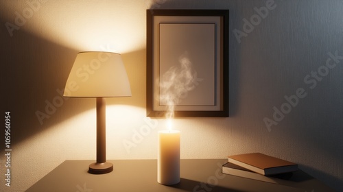 In a tranquil setting, an open book rests on a wooden desk, accompanied by a lit candle casting soft shadows, while gentle smoke wafts upwards, creating an inviting atmosphere.