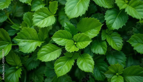 In a vibrant garden, various green leaves thrive under natural sunlight, showcasing their rich textures and shades, creating a serene atmosphere of growth and vitality