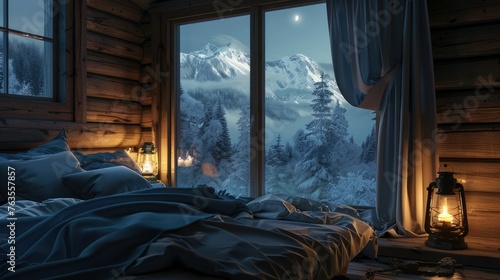 In the evening, in a cozy wooden house with a bed and a view of the forested mountains, the light of lamps creates a romantic atmosphere. Panoramic window overlooking a beautiful landscape