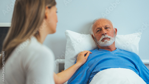 In the Hospital Ward Recovering Father is Visited by Daughter. Senior Sick Man Sleeping in Bed Daughter Sits Beside, Worrying. Modern Private Ward. Family Values.