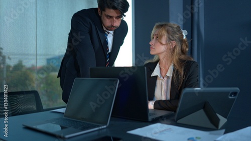 In the office, two businessmen and women encourage each other after a mistake in their work