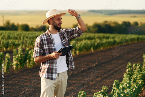 In the straw hat. Farmer is on the agricultural field
