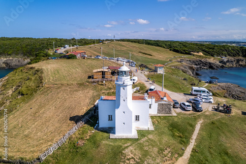 Inceburun Lighthouse in Sinop. Turkey. Inceburun is the northernmost point of the Turkey. Aerial shooting with drone.