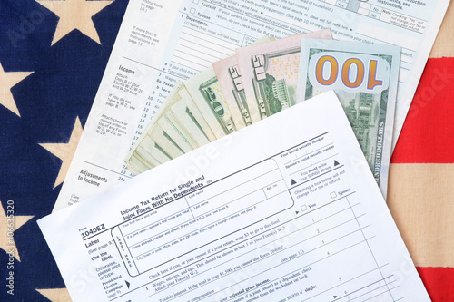 income tax forms money and American flag