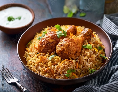 Indian Chicken Tikka Biriyani served in a bowl with yogurt