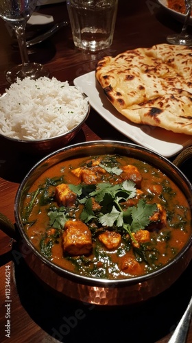 Indian feast with chicken curry and naan