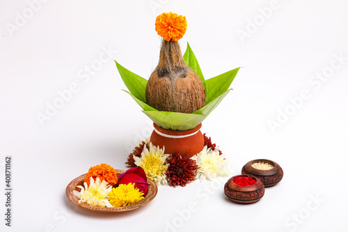 Indian festival akshaya tritiya concept : Decorative coconut with green leaf in clay pot on white background