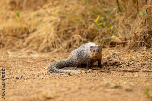 Indian grey mongoose or Herpestes edwardsii portrait with eye contact in central india forest