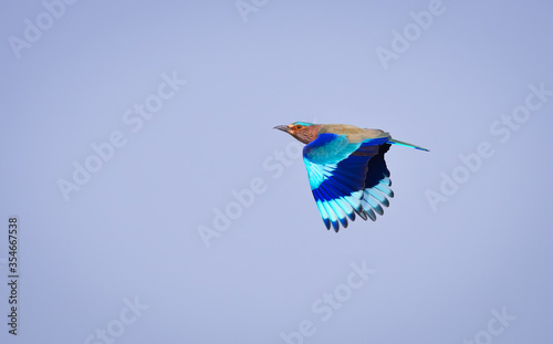 Indian roller flying with wings open