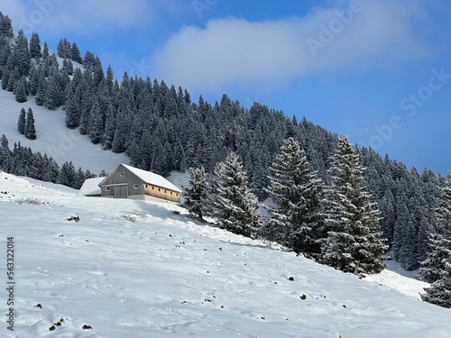 Indigenous alpine huts and wooden cattle stables in the Swiss Alps covered with fresh first snow over the Lake Walen or Lake Walenstadt (Walensee), Amden - Canton of St. Gallen, Switzerland / Schweiz