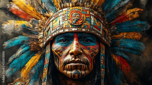 Indigenous chief wearing colorful headdress and face paint