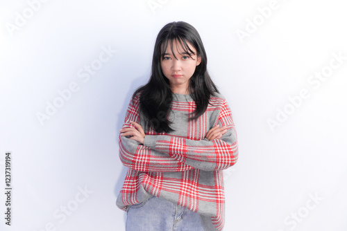 Indonesian Asian woman with long black hair wearing a red checked shirt with her arms crossed